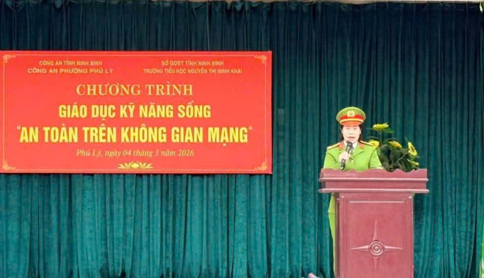 Đặc biệt, chương trình vinh dự được đón đồng chí Trung tá Hoàng Vũ Bạch Liên – cán bộ Tổ Cảnh sát khu vực Công an phường Phủ Lý tuyên truyền và hướng dẫn kỹ năng an toàn trên không gian mạng. Bằng những câu chuyện thực tế, gần gũi, đồng chí đã giúp học sinh hiểu rõ hơn về các hình thức lừa đảo phổ biến, cách bảo mật thông tin cá nhân, ứng xử văn minh trên mạng và cách xử lý khi gặp tình huống nguy hiểm. Phần tuyên truyền không chỉ bổ ích mà còn góp phần nâng cao ý thức tự bảo vệ mình cho các em học sinh.